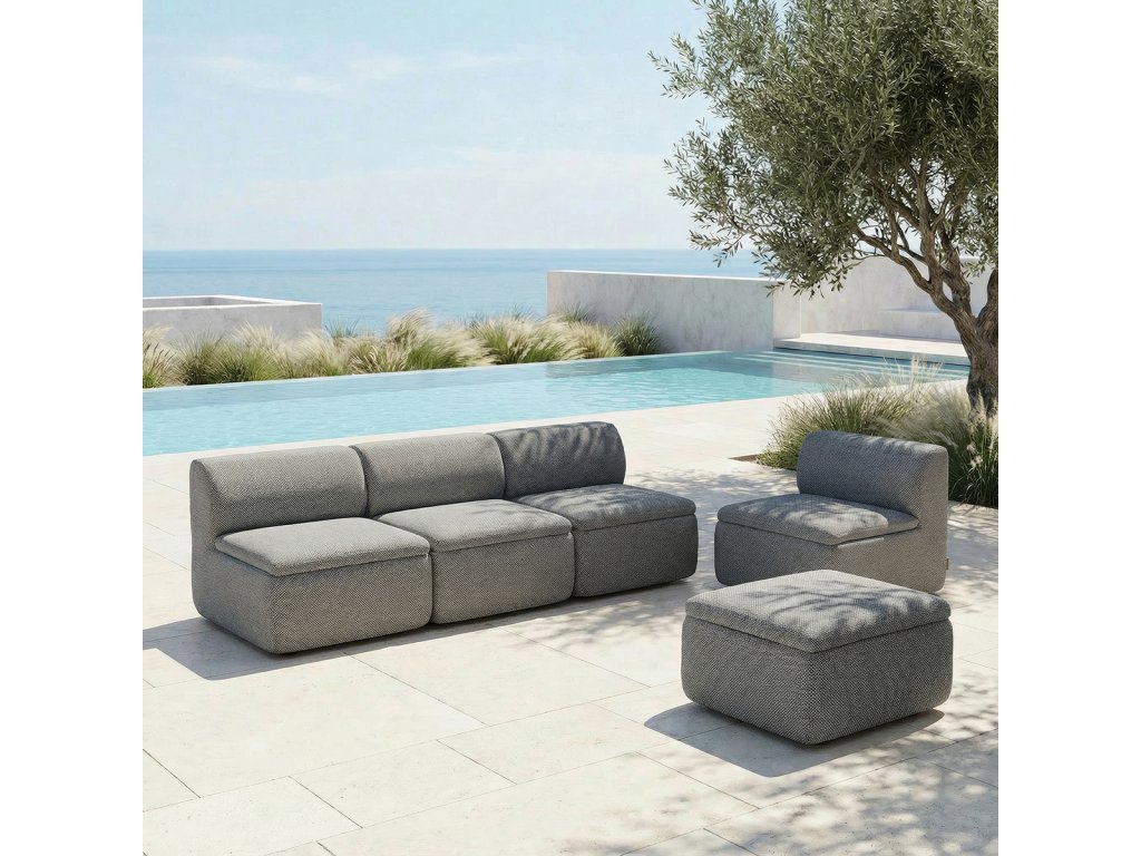 Modul je vyroben z odolného olefinového textilu, který je příjemný na dotek a odolává venkovním povětrnostním vlivům. Svrchní lehce polstrovaný memory pěnový polštář se přizpůsobí tělu, což zajišťuje pohodlné a relaxační posezení. Díky modulární konstrukci můžete kombinovat jednotlivé kusy do větších lounge sestav přesně podle vašich potřeb – od samostatného relaxačního křesla až po stylovou zahradní lounge.