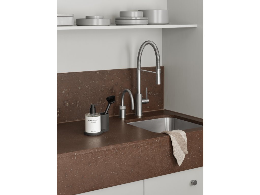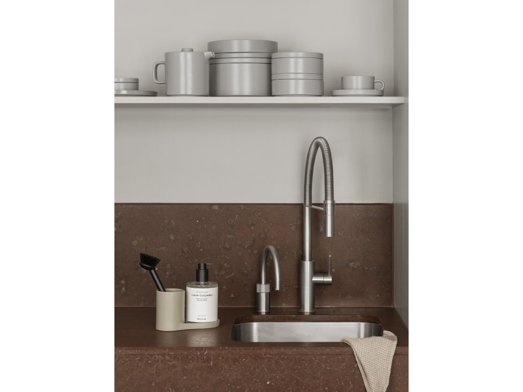 Uspořádejte svou kuchyni stylově s kuchyňskou sadou PIRO. Hrnek z vysoce kvalitní keramiky v kombinaci s integrovanou poličkou přináší do kuchyně pořádek a estetiku. Speciálně navrženo pro sérii SATOMI, mycí prostředek lze ideálně umístit na tác. Drážky v tácu zajišťují, že mýdlo a prostředek na nádobí zůstanou suché. Na připojeném hrnku je prostor pro kartáč na mytí nádobí. Ideální volbou je náš kartáč ARJA, který tvoří harmonický celek ve spojení s PIRO.